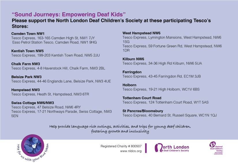 Please support the NLDCS by visiting participating Tesco’s stores and dropping a blue voting token in our “Sound Journeys: Empowering Deaf Kids” campaign.